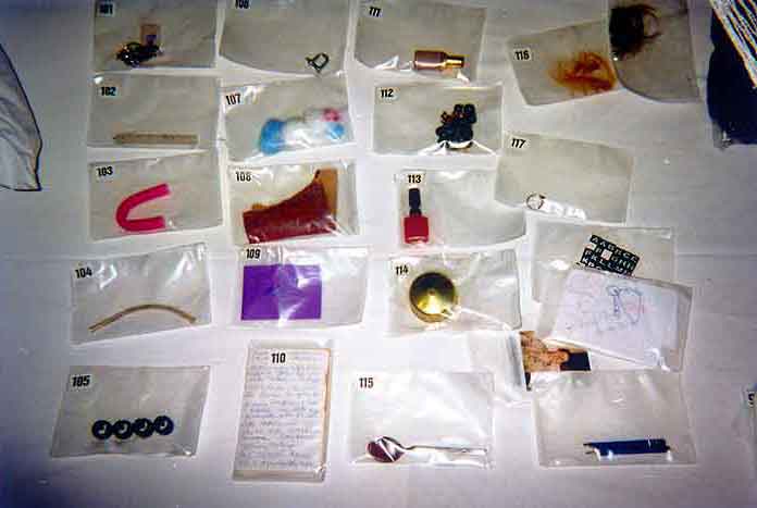in Klarsichtbeuteln verpackt, numeriert. Liste: Bestandsaufnahme der aufgefundenen