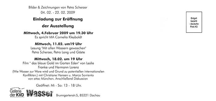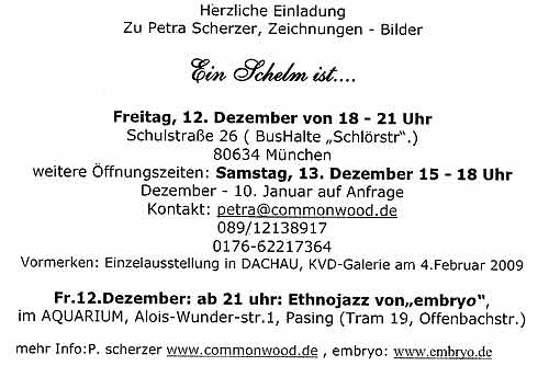Vom 05.09.10 bis zum 10.10.10 präsentieren wir in unseren Galerieräumen Zeichnungen und Gemälde der Künstlerin Petra Scherzer. Die Ausstellung ist Di - Do von 15 - 19 Uhr u.n.V. zu besichtigen.
